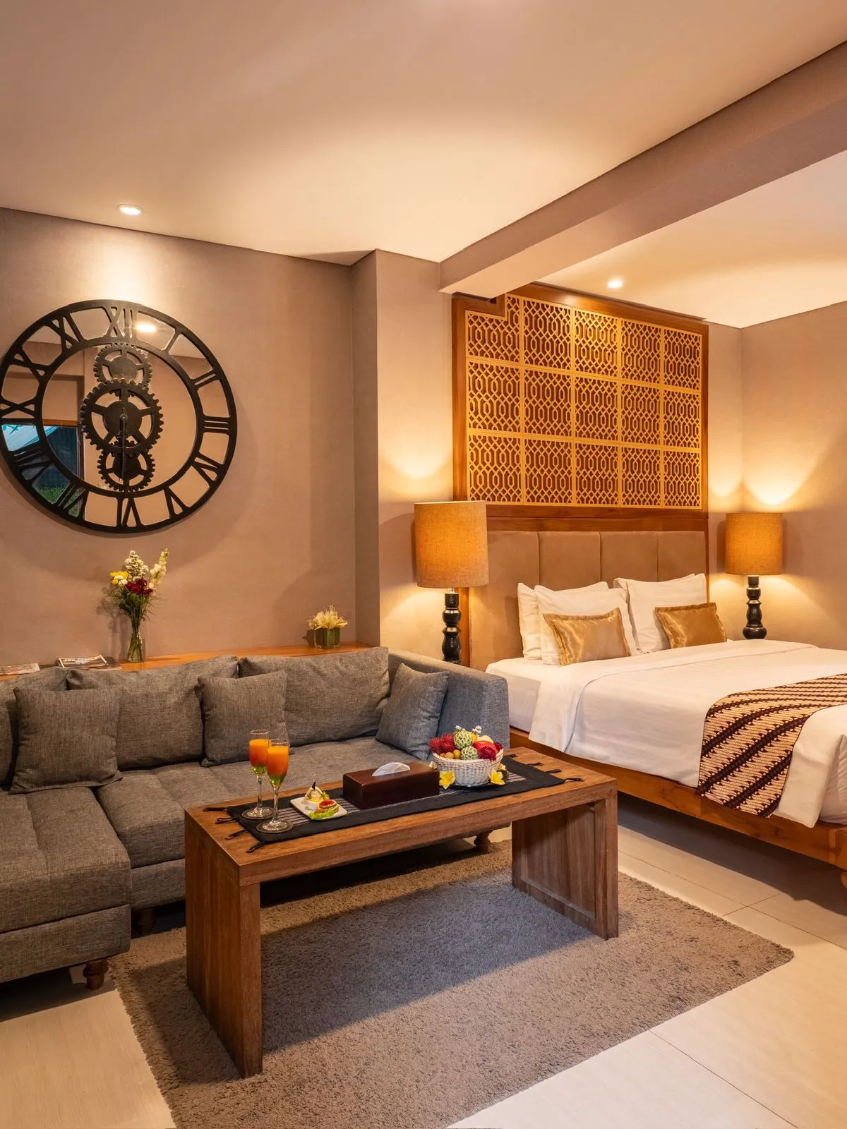 Enjoy elevated comfort in our Deluxe Premium Room with pool view, featuring a plush queen-size bed, elegant wooden accents, and a cozy sofa lounge. Blending modern style with boutique charm, the room offers air-conditioning, flat-screen TV, tea and coffee facilities, minibar, wardrobes, safety box and a private bathroom with hot shower, fresh towels and toiletries. A refined retreat for guests who value both comfort and sophistication.