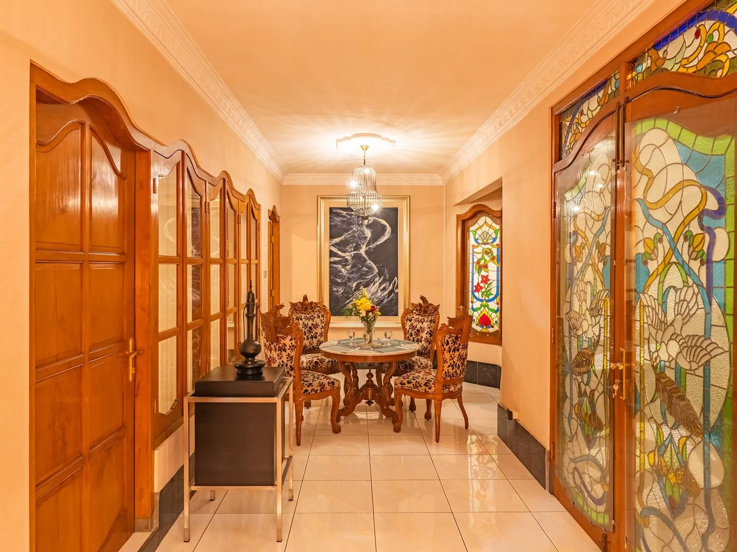- Highlights: The President Suite offers a private living room with plush seating, elegant décor, and warm lighting — perfect for relaxation or intimate gatherings. Flowing seamlessly, the dining area features a carved-wood table, stained-glass windows, and a chandelier-lit ambiance, paired with a convenient kitchenette. A refined blend of comfort, artistry, and privacy. A terrace where chandeliers glow, tropical leaves whisper, and every sip of coffee feels like poetry under the stars.
